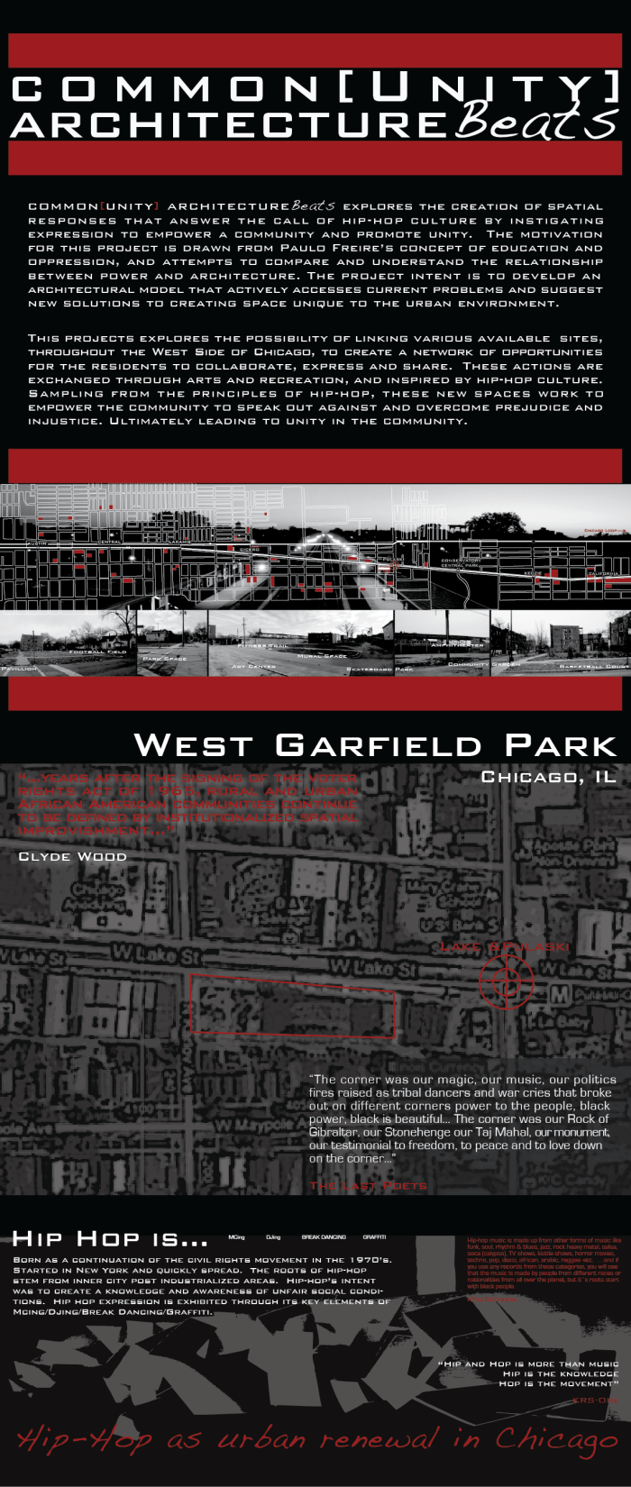 My site analysis process was inspired by my daily commute from Forest Park (west suburb of Chicago) to the Loop on the Green Line L’ Train. Twice a day I observed the changes of the neighborhoods and became interested in the politics of why this was visible. I passed through the neighborhoods of Oak Park, Austin, Garfield Park, and the West Loop, witnessing moments of historical remnants, urban development/decay, and opportunities for growth and hope. In the map above the red rectangles represent the open spaces (almost all visible from the Green Line route) available for the spatial responses I am proposing. These responses can include public parks, urban gardens, amphitheaters, art centers, mural spaces, fitness parks, pavilions and other community common spaces that may influence a strong since of pride in the neighborhood where you reside, creating areas of improvisation, dialogue, empowerment, remembrance, education, expression and anything freestyle[d].