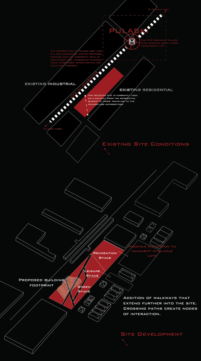 The site I chose was the intersection of Pulaski and Lake, West Garfield Park. I began by looking at how the site was used by the community in it’s vacant state, and expanded on that.
